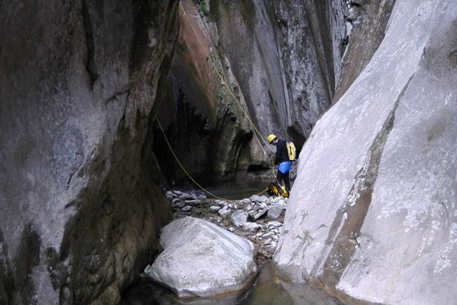 Εν τω μεταξύ έχουμε φορέσει τις νεοπρέν και τα μποντριέ και έχουμε περάσει το πρώτο δύσκολο σημείο. Αρχίζουμε να μπαίνουμε στο φαράγγι. Η θερμοκρασία του σώματος πλησιάζει το σημείο βρασμού μέσα στις θεόστενες στολές. Πρέπει επείγοντος να βρούμε νερό. Έχουμε φτάσει στο δεύτερο ραπέλ και στο πρώτο που έχουν τοποθετηθεί τεχνητές ασφάλειες (από την πρώτη διάσχιση). Κατεβαίνουμε και πλέον το Στενό Λαγκάδι δικαιολογεί απόλυτα το όνομά του. Στενά πανύψηλα τοιχώματα μας περιβάλλουν δημιουργώντας μια τεράστια σχισμή στο βουνό. Εδώ δεν υπάρχει πια καμία δίοδος διαφυγής. Όμως εμείς αναζητούμε εναγωνίως την αιτία της δεύτερης ονομασίας του φαραγγιού που ακούει επίσης στο όνομα: «Πολύ Ποτάμι» Ψηνόμαστε μέσα στις στολές….