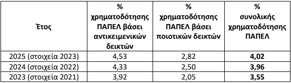 - Η διαδικασία χρηματοδότησης των ελληνικών δημόσιων Πανεπιστημίων βασίζεται σε ένα μεικτό σύστημα που αποτελείται από δύο κατηγορίες δεικτών για κάθε Πανεπιστήμιο: (α) αντικειμενικοί δείκτες σε ποσοστό 70% και (β) ποιοτικοί δείκτες σε ποσοστό 30% ώστε να αποδοθεί η εικόνα κάθε Πανεπιστημίου σφαιρικά. Υπενθυμίζεται ότι μέχρι πέρυσι η παραπάνω αναλογία ήταν 80% - 20%. Ο συνδυασμός όλων των δεικτών δίνει το συνολικό ποσοστό χρηματοδότησης κάθε δημόσιου Πανεπιστημίου από τον τακτικό κρατικό προϋπολογισμό.