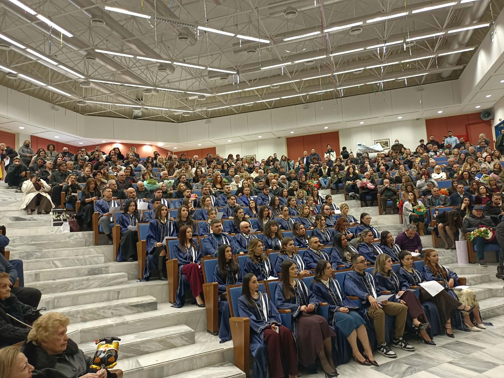 Συνολικά 55 νέοι επιστήμονες ορκίστηκαν, ολοκληρώνοντας έναν απαιτητικό αλλά δημιουργικό κύκλο σπουδών και ανοίγοντας ένα νέο κεφάλαιο στην επαγγελματική και προσωπική τους διαδρομή. Την απαγγελία της καθομολόγησης έκανε ο πρωτεύσας Γιώργος Παυλιδάκης, μέσα σε κλίμα έντονης συγκίνησης και ενθουσιασμού, με το θερμό χειροκρότημα να επισφραγίζει την προσπάθεια και την επιμονή των αποφοίτων όλα αυτά τα χρόνια.
