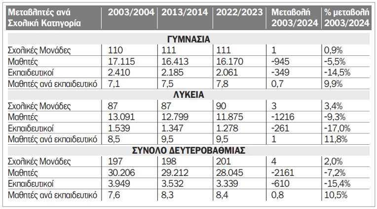 - Γυμνάσια: Η μείωση των μαθητών έφτασε το 5,5%, ενώ οι εκπαιδευτικοί μειώθηκαν κατά 14,5%.