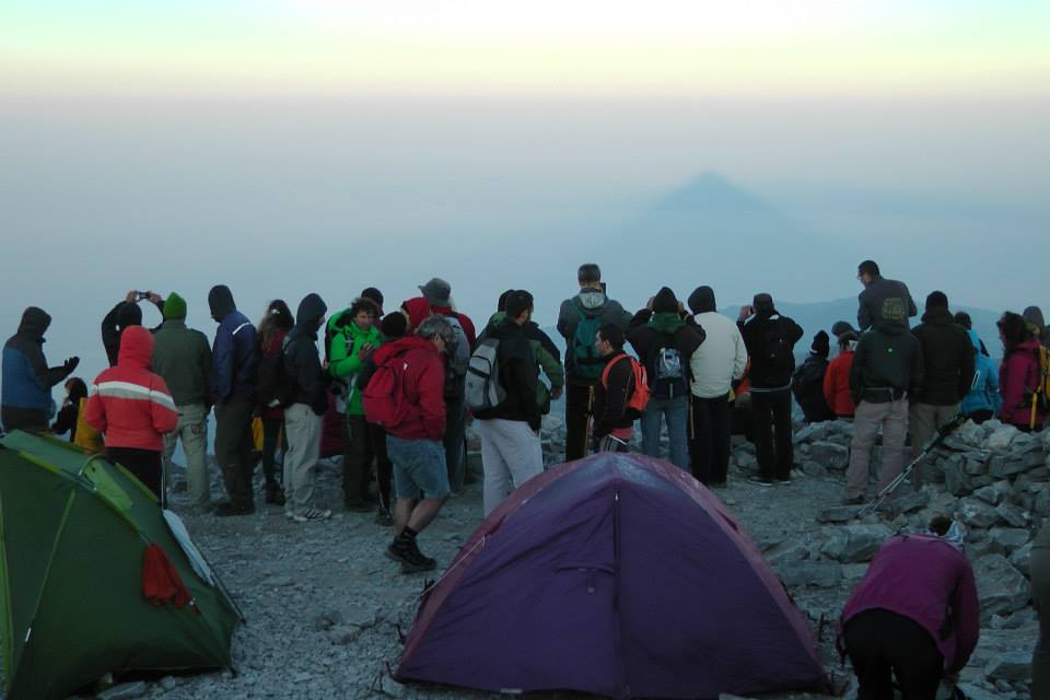 Σιγά σιγά πλησίαζε 6.20, η ώρα της ανατολής του ηλίου. Ολοι περιμένανε με ανυπομονησία την αυγή για να απολαύσουν το περίφημο φαινόμενο της «Πυραμίδας του Ταϋγέτου». Είχε ήδη ξεκινήσει. Ελάχιστα λεπτά πριν ανατείλει ο ήλιος, σχηματίζεται μέσα στον μεσσηνιακό κόλπο η τέλεια ισόπλευρη τριγωνική σκιά της κορυφής του Ταϋγέτου. Σταθήκαμε τυχεροί γιατί η ατμόσφαιρα ήτανε πολύ καθαρή και μας επέτρεπε να δούμε την πυραμίδα πεντακάθαρα. Βγάλαμε πολύ όμορφες φωτογραφίες μαζί με όλα τα άτομα του συλλόγου, και αφού είχε ανέβει για τα καλά ο ήλιος ξεκινήσαμε την κατάβαση.