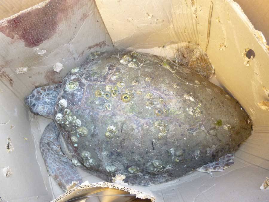 Η χελώνα είχε τραυματιστεί σοβαρά στο μπροστινό δεξί της πόδι, το οποίο είχε κοπεί, ενώ παραγάδια είχαν τυλιχθεί και στο πίσω πόδι της. Σύμφωνα με πληροφορίες μας, τη χελώνα τράβηξε στην ακτή, σώζοντάς την νεαρός κολυμβητής.