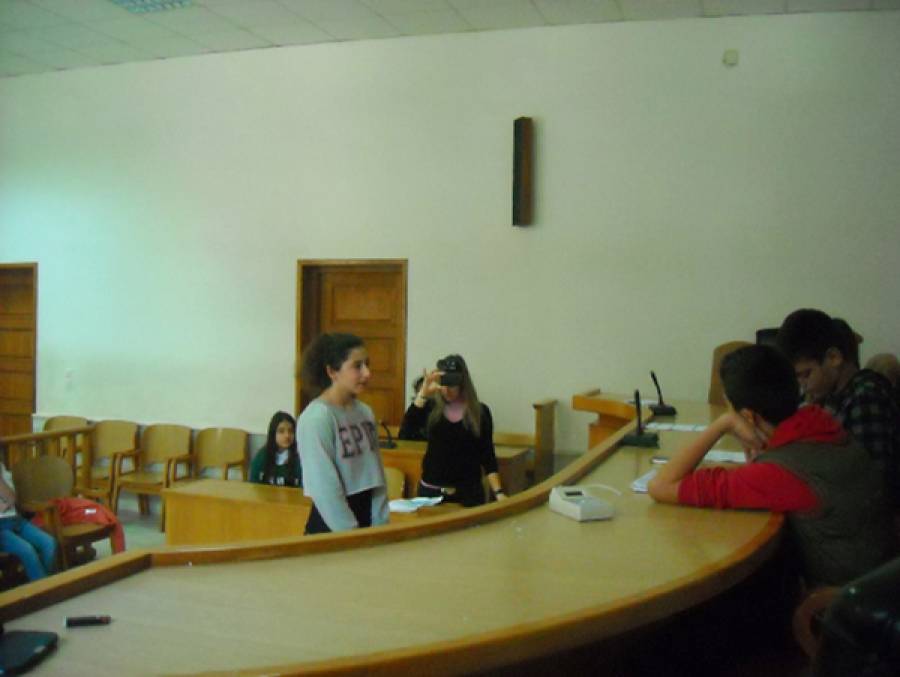Κατόπιν άδειας από την πρόεδρο του Πρωτοδικείου και με τη συνδρομή της, έγινε ξενάγηση των μαθητών από δικαστικό υπάλληλο, για το διαχωρισμό των δικαστηρίων ανάλογα με το είδος των αδικημάτων και την διάκρισή τους σε πολιτικά, αστικά, πολιτικά και ανηλίκων. Τα παιδιά είδαν ακόμη αναπαράσταση εικονικής δίκης σε αίθουσα του Πλημμελειοδικείου. Εκεί έζησαν μια "πραγματική" δίκη (με πρόεδρο, εισαγγελέα, γραμματέα, κατηγορούμενους, μάρτυρες, συνήγορους, κοινό) και παράλληλα προσπάθησαν να υπερασπίσουν τα δικαιώματά τους με πειθώ και επιχειρήματα, όπως όριζε το σενάριο, που είχαν προετοιμάσει από το σχολείο.