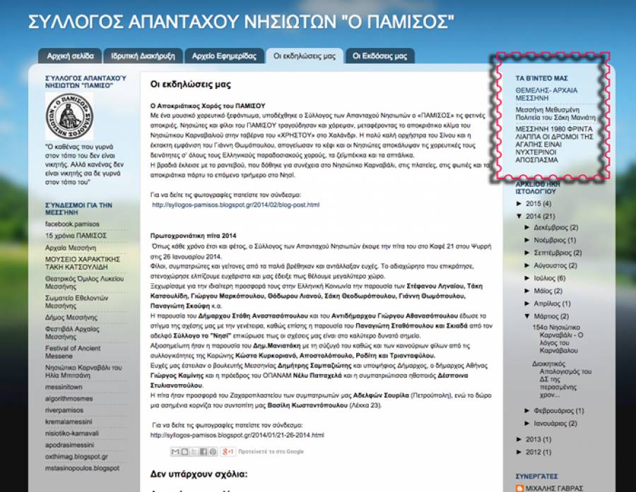 Με μια καινούρια κατηγορία εμπλουτίστηκε η ιστοσελίδα του Συλλόγου Νησιωτών Αττικής "Ο Πάμισος". Στο http://syllogos-pamisos.blogspot.gr μπορεί κανείς να δει παλιότερα βίντεο καλλιτεχνικού ενδιαφέροντος, που αφορούν την περιοχή.
