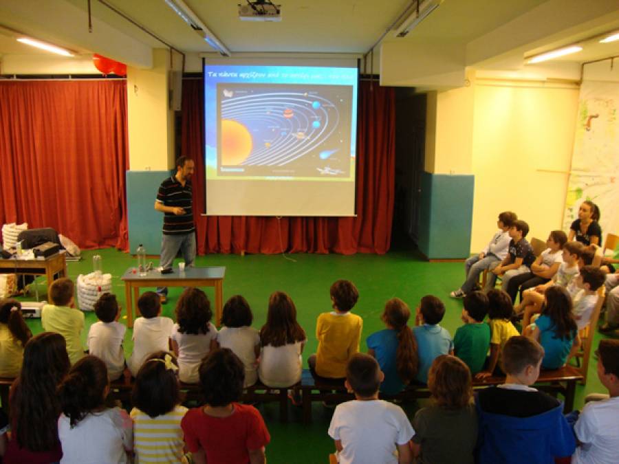 Αρχικά, ο κ. Μαζαράκης ενημέρωσε τους μαθητές για το ηλιοκεντρικό μας σύστημα, την τροχιά των πλανητών γύρω από τον ήλιο και για το πώς αυτή επιδρά στις εποχές του πλανήτη.