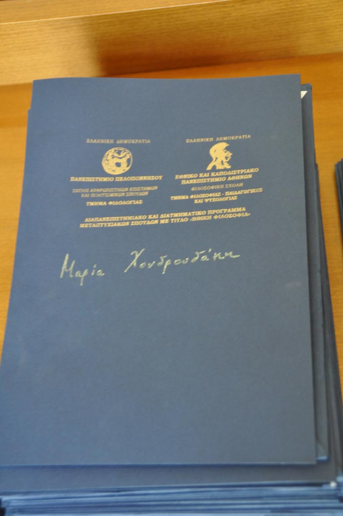 Μεταπτυχιακό πρόγραμμα «Ηθική φιλοσοφία»: Κυριακή Βασιλοπούλου, Αντωνία Γαλακούτη, Χαρίκλεια Γρηγορίου, Μιλτιάδης Δημόπουλος, Αμαλία Καλλιάνου, Μυρτώ Καμβυσίδη, Δήμητρα Κιτσούλη, Κυριακή Κούγια, Φωτεινή Λέκκα, Κωνσταντίνα Μαδούρου, Μαρία Μάλαμα, Βασιλική Μαντζούνη, Δήμητρα Μαυρίδου, Κατίνα Μητσάκου, Βασιλική Μπάκα, Κριστιάνα Μπράχου, Γεώργιος Πανέτας, Μαρία Πατικοπούλου, Χρυσοβαλάντω - Πόπη Πετροπούλου, Σταματίνα Σελλή, Ιωάννης Σκουρλής, Θεόδωρος Σταυριανόπουλος, Σταυρούλα - Φωτεινή Σταυριανοπούλου, Βασιλική Συφαλάκη, Θεοδώρα Τσούγκου, Δήμητρα Χαντζή, Πηνελόπη Χασάπη, Ιωάννης - Ευάγγελος Χασαπογιάννης, Μαρία Χονδρουδάκη, Αρετή Χουντή.