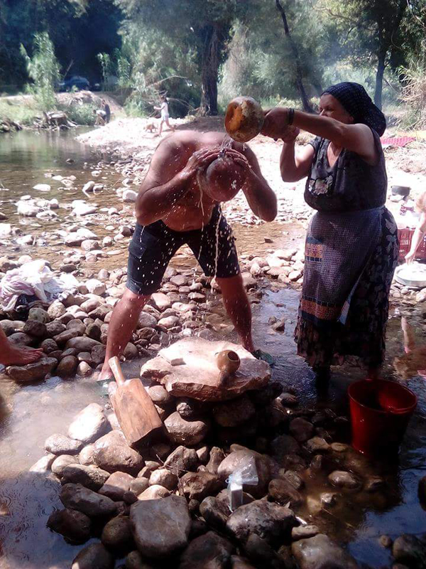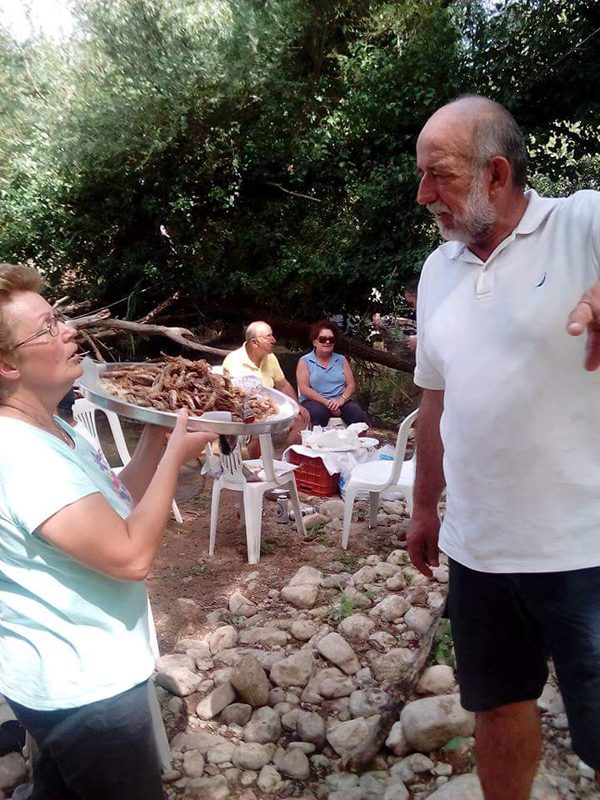 Στη συνέχεια, λουστήκαμε με νερό που είχε αλισίβα, πλυθήκαμε και απολαύσαμε τα καλομαγειρεμένα φαγητά των γυναικών – κολοκυθομαγειρέματα, ψάρια τηγανητά δίπλα στο ποτάμι, σουβλάκια, άφθονο κρασί και νερό από τη βρύση του Σταμάτη. Ο Δημήτρης με τον εγγονό Γιώργο (οι 'Καρεκλάδες') μας έδειξαν πώς φτιάχνουμε καρέκλες με ''μαρίτσα'' (φυτό που φυτρώνει δίπλα από το ποτάμι). Μέσα στο ποτάμι ήταν παγωμένα φραγκόσυκα και σταφύλια της περιοχής που το γάργαρο νερό μοίραζε στις όχθες για να τα απολαύσουμε όλοι!