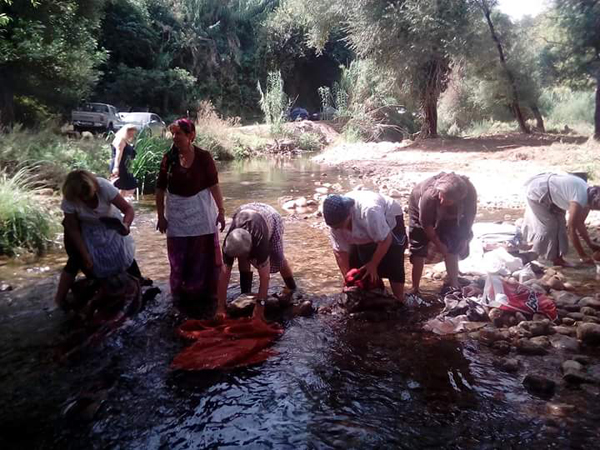 Γυναίκες ντυμένες με παραδοσιακά χειροποίητα ρούχα – με τις κλώσσες και τα κλωσσόπουλα, τη νάκα με τον μπέμπη, το πινιάτι με το κολατσιό, φορτωμένες με κουρελούδες, σαίσματα, αντρομίδες και καζάνια, περπάτησαν ανάμεσά μας μελωδώντας παραδοσιακά τραγούδια. Πήραν τις θέσεις τους μες το νερό και μας έδειξαν πώς κοπάναγαν τα ρούχα με τον κόπανο πάνω στις πέτρες του ποταμού. Επειτα, μας παρακίνησαν χαμογελαστές: ''ας δοκιμάσει κι όποιος θέλει''!