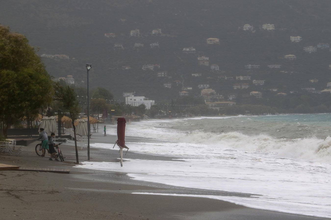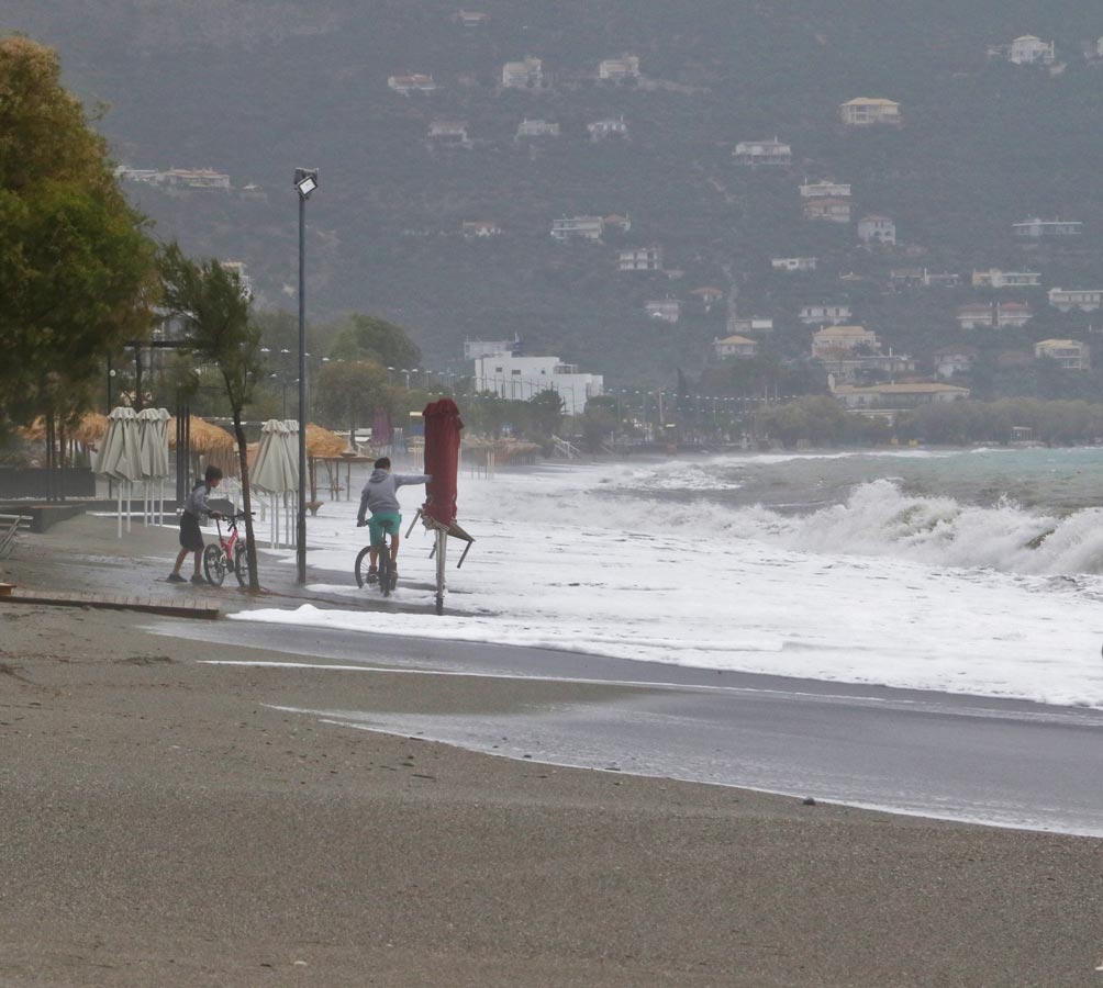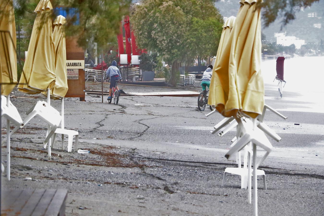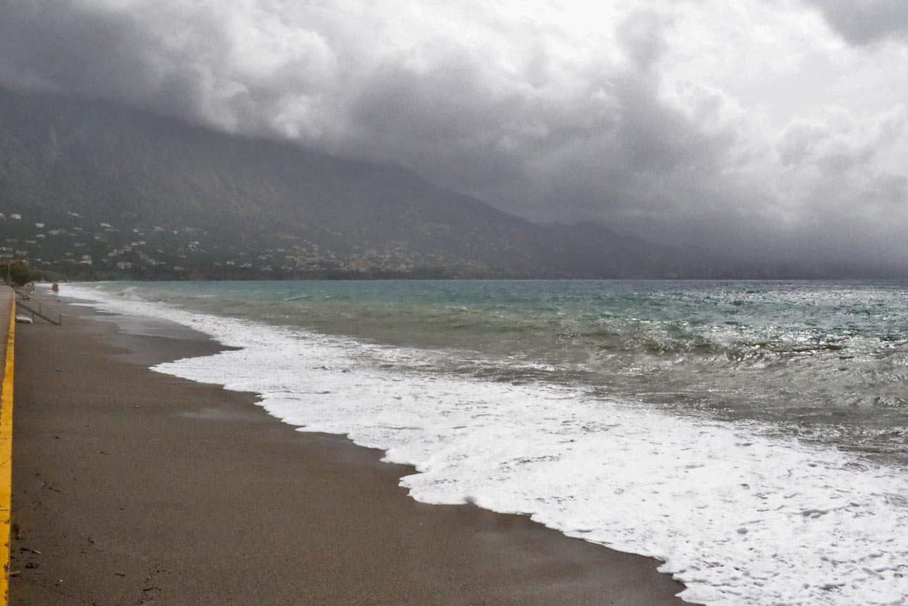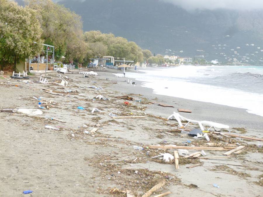 Τα τεράστια κύματα από τους ισχυρούς νοτιάδες ξέβρασαν καλάμια και άλλα σκουπίδια και παρέσυραν τις καρέκλες που είχαν απομείνει στην ακτή για τους κολυμβητές του φθινοπώρου.