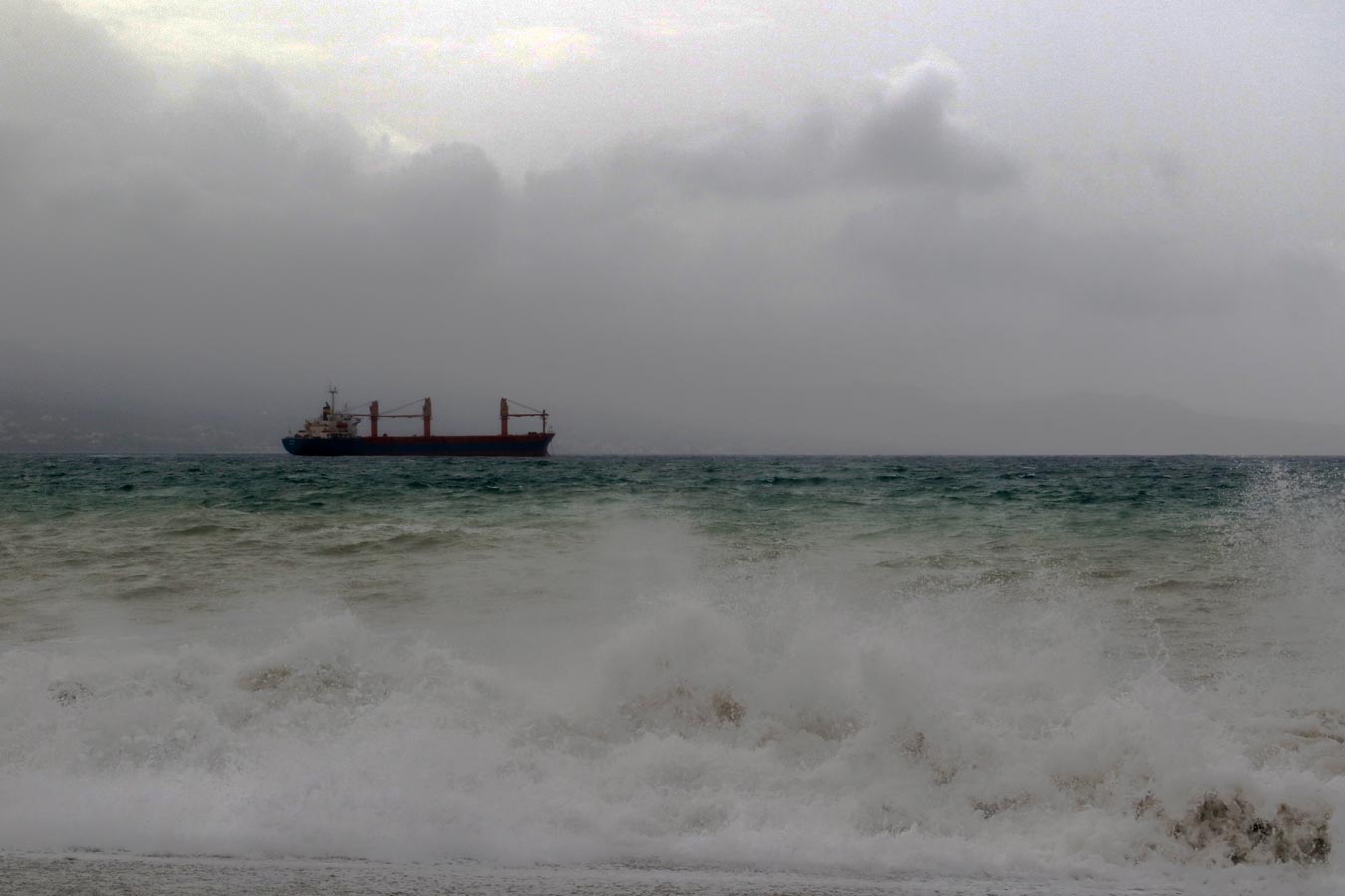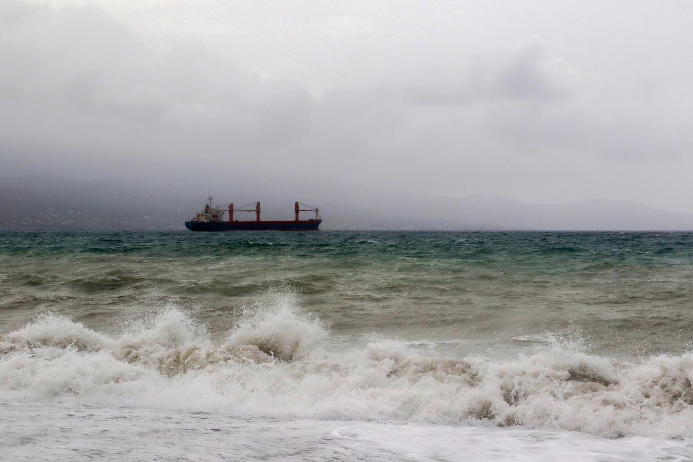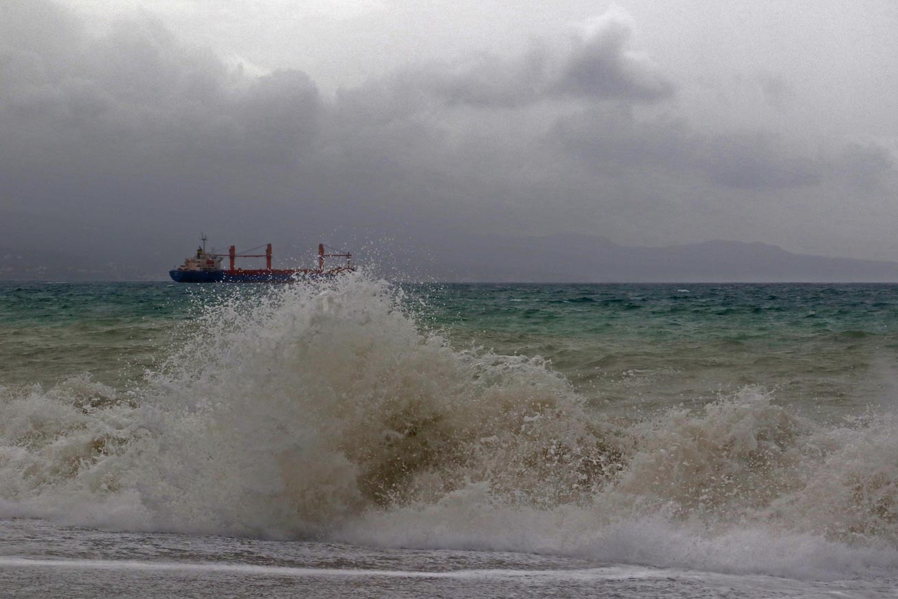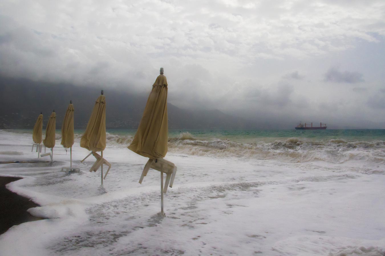Τα τεράστια κύματα από τους ισχυρούς νοτιάδες ξέβρασαν καλάμια και άλλα σκουπίδια και παρέσυραν τις καρέκλες που είχαν απομείνει στην ακτή για τους κολυμβητές του φθινοπώρου.
