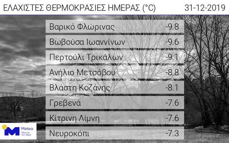 Όπως φαίνεται στον πίνακα που ακολουθεί και παρουσιάζει τις 8 χαμηλότερες ελάχιστες θερμοκρασίες που κατέγραψαν οι σταθμοί του δικτύου αυτόματων μετεωρολογικών σταθμών του Εθνικού Αστεροσκοπείου Αθηνών / meteo.gr, η χαμηλότερη ελάχιστη θερμοκρασία καταγράφηκε στο Βαρικό Φλώρινας και ήταν ίση με -9,8 βαθμούς Κελσίου.