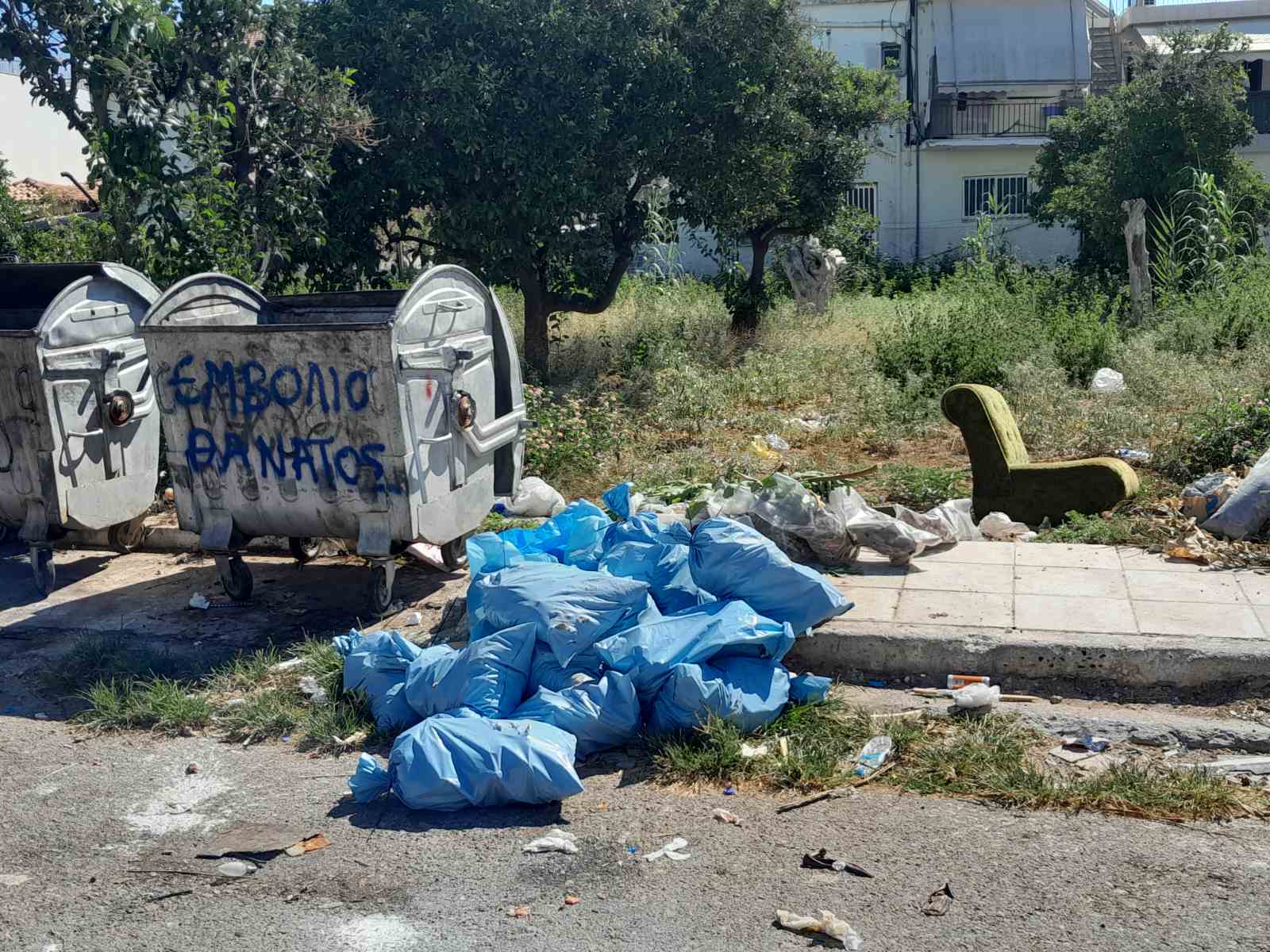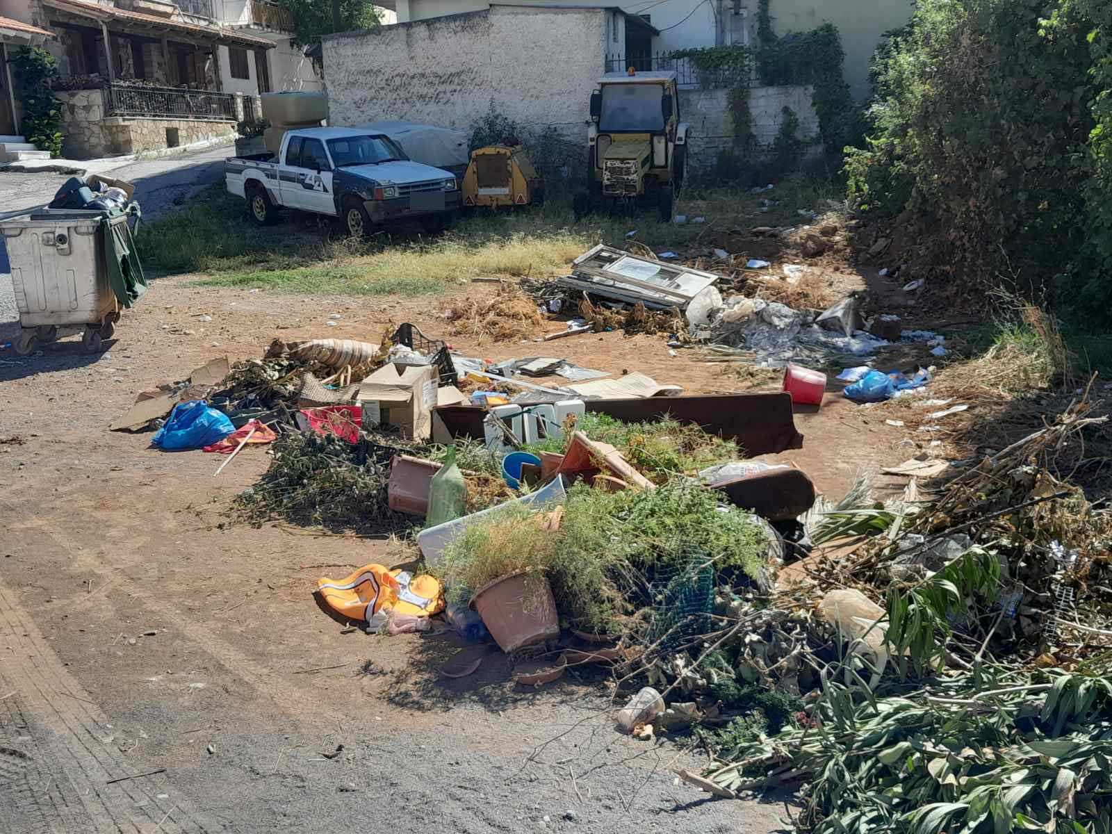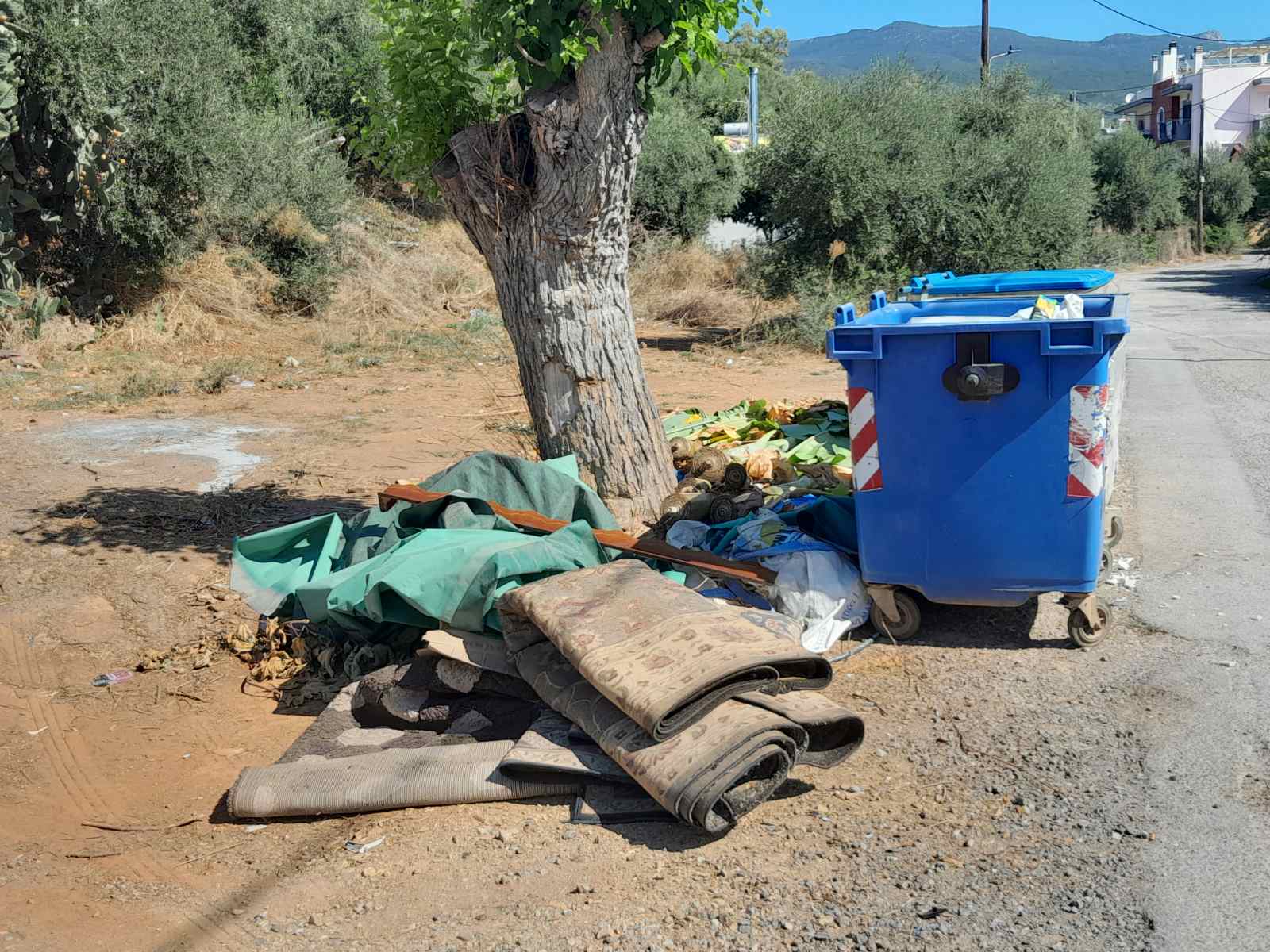 Γύρω από κάδους σκουπιδιών έχουν εγκαταλειφθεί παλιά χαλιά, μεγάλα κλαριά από δέντρα, σακούλες με οικοδομικά υλικά και παλιά έπιπλα, δημιουργώντας εικόνα ρύπανσης και υποβάθμισης της περιοχής,