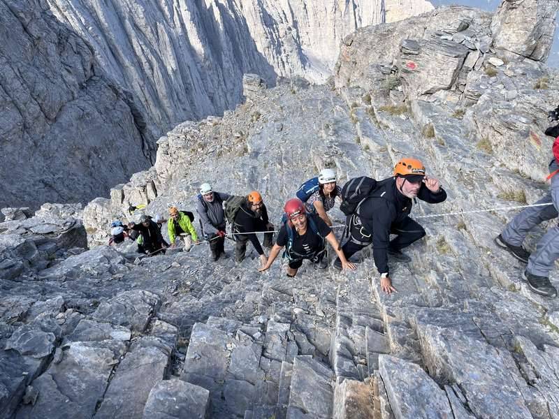 Χωρισμένοι σε δύο ομάδες και ακολουθώντας το μονοπάτι Ε4, η πρώτη ομάδα κατέκτησε την κορυφή Σκάλα (2.909 μ.) και τον Μύτικα (2.918 μ.), με τη συνοδεία του πιστοποιημένου οδηγού βουνού της Ε.Ο.Ο.Α. Γεώργιου Μάλαμα. Η δεύτερη ομάδα γνώρισε το Οροπέδιο των Μουσών και τις κορυφές Προφήτη Ηλία (2.803 μ.) και Μεγάλη Τούμπα (2.801 μ.), με οδηγό-συντονιστή και μέλος του Δ.Σ. του συλλόγου, Κωνσταντίνο Θερμό.