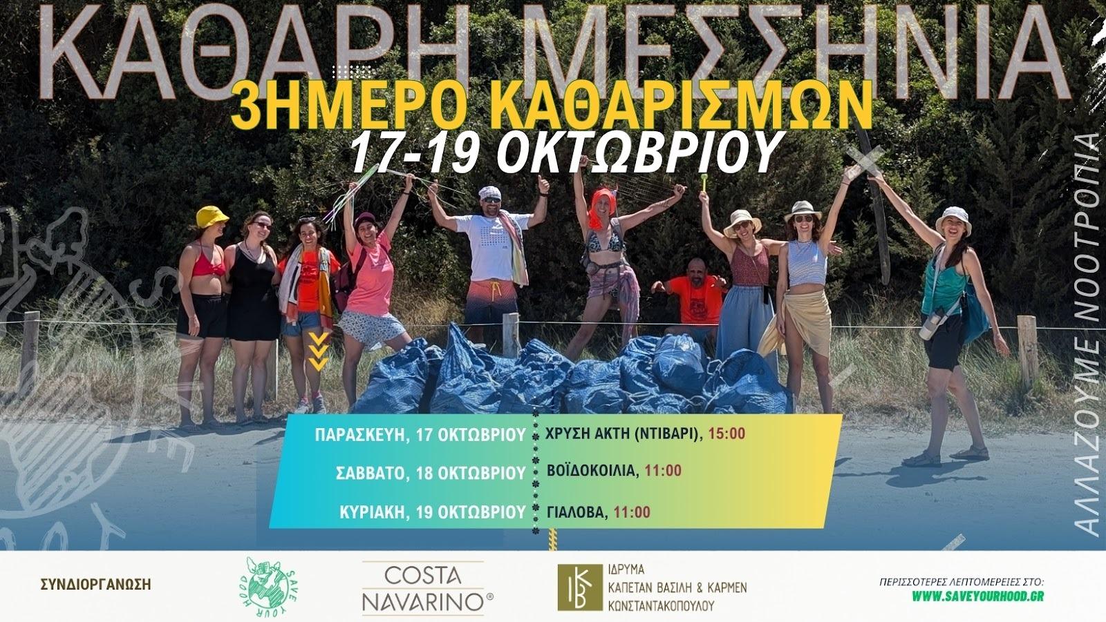 Η Μεσσηνία ετοιμάζεται να φορέσει και πάλι τα «καθαρά» της, καθώς η εθελοντική ομάδα Save Your Hood, στο πλαίσιο του προγράμματος «Καθαρή Μεσσηνία», διοργανώνει ένα τριήμερο ανοιχτών δράσεων καθαρισμού από τις 17 έως τις 19 Οκτωβρίου.