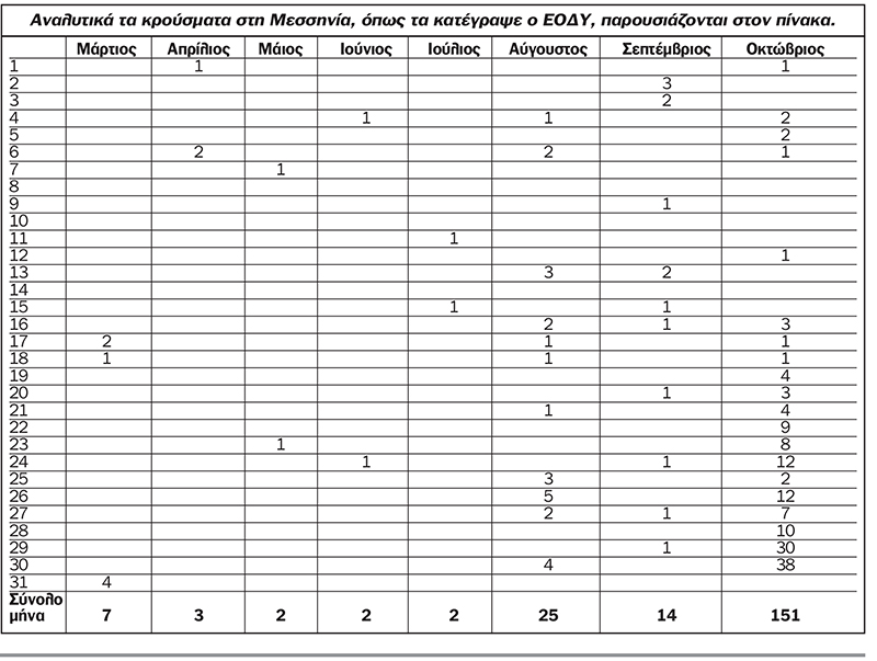 Αναλυτικά τα κρούσματα στην Μεσσηνία, όπως τα κατέγραψε ο ΕΟΔΥ, παρουσιάζονται στον πίνακα.