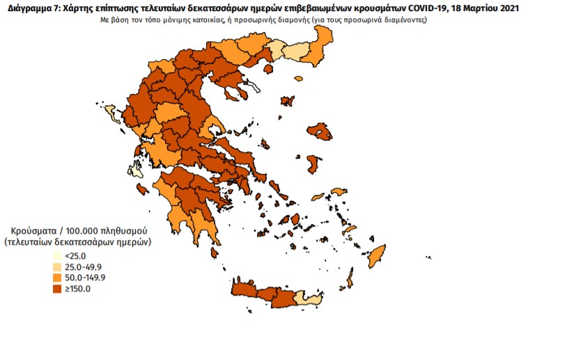Με βάση τα επιβεβαιωμένα κρούσματα των τελευταίων 7 ημερών, 67 θεωρούνται σχετιζόμενα με ταξίδι από το εξωτερικό και 1.889 είναι σχετιζόμενα με ήδη γνωστό κρούσμα.