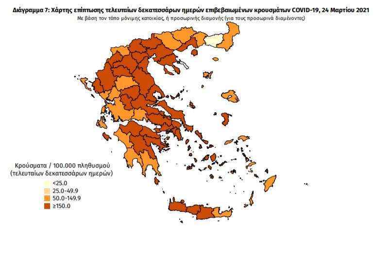 Οι νέοι θάνατοι ασθενών με COVID-19 είναι 67, ενώ από την έναρξη της επιδημίας έχουν καταγραφεί συνολικά 7.649 θάνατοι. Το 95.7% είχε υποκείμενο νόσημα ή/και ηλικία 70 ετών και άνω.