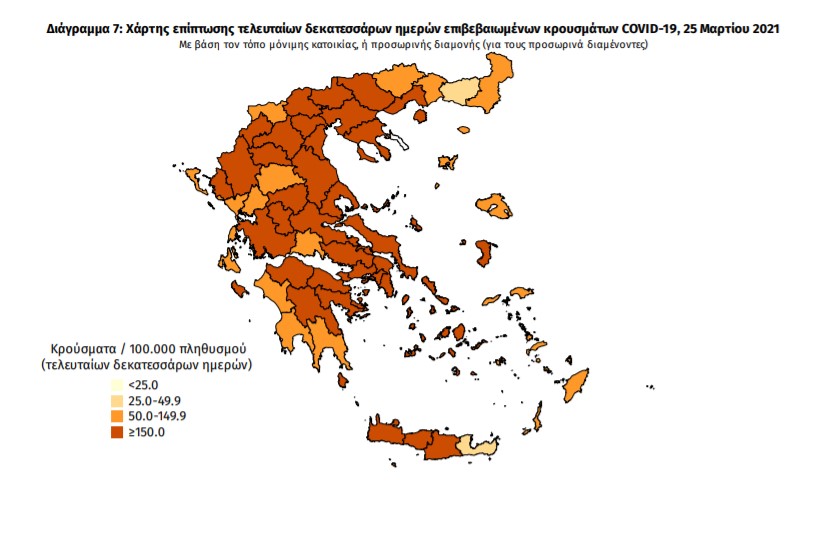 Με βάση τα επιβεβαιωμένα κρούσματα των τελευταίων 7 ημερών, 76 θεωρούνται σχετιζόμενα με ταξίδι από το εξωτερικό και 2.969 είναι σχετιζόμενα με ήδη γνωστό κρούσμα.