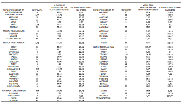 Αναλυτικά ο χάρτης των κρουσμάτων στην Ελλάδα, όπως και ο μέσος όρος κρουσμάτων της τελευταίας εβδομάδας ανά νομό, αλλά και τα κρούσματα ανά 100.000 πληθυσμό φαίνονται στον παρακάτω πίνακα: