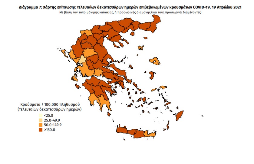 Με βάση τα επιβεβαιωμένα κρούσματα των τελευταίων 7 ημερών, 59 θεωρούνται σχετιζόμενα με ταξίδι από το εξωτερικό και 3.072 είναι σχετιζόμενα με ήδη γνωστό κρούσμα.