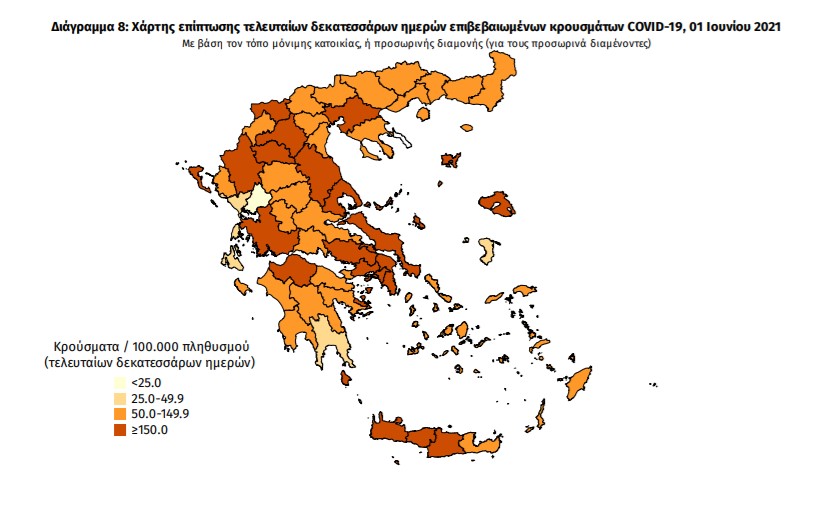 Με βάση τα επιβεβαιωμένα κρούσματα των τελευταίων 7 ημερών, 29 θεωρούνται σχετιζόμενα με ταξίδι από το εξωτερικό και 1.880 είναι σχετιζόμενα με ήδη γνωστό κρούσμα.