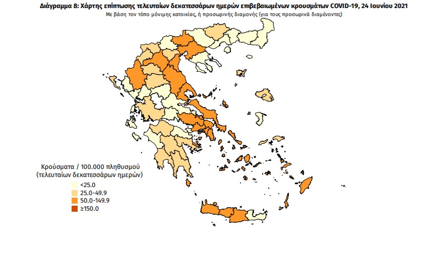Με βάση τα επιβεβαιωμένα κρούσματα των τελευταίων 7 ημερών, 38 θεωρούνται σχετιζόμενα με ταξίδι από το εξωτερικό και 595 είναι σχετιζόμενα με ήδη γνωστό κρούσμα.