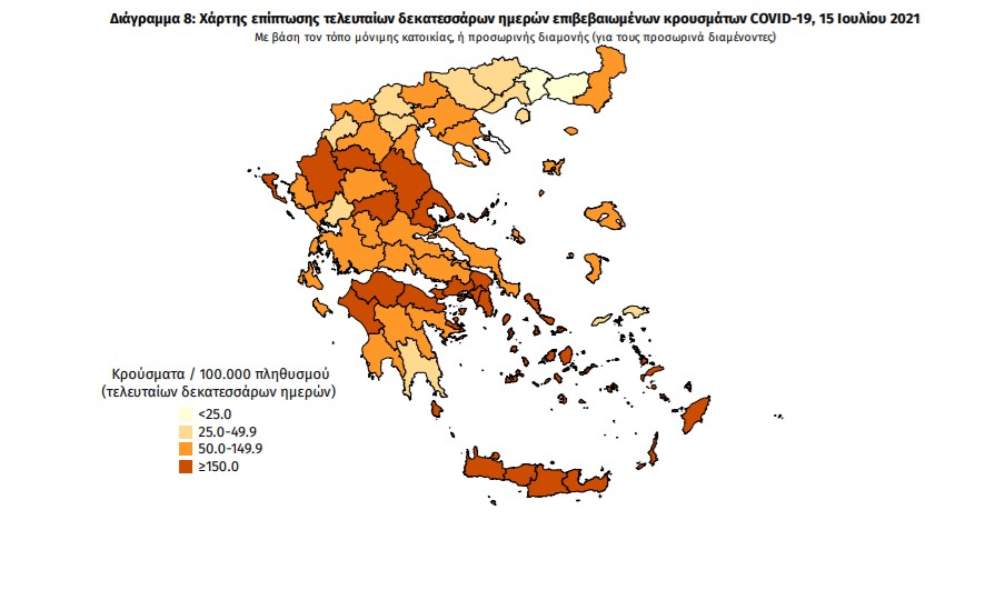 Ο συνολικός αριθμός των κρουσμάτων ανέρχεται σε 450.512 (ημερήσια μεταβολή +0.6%), εκ των οποίων 51.2% άνδρες. Με βάση τα επιβεβαιωμένα κρούσματα των τελευταίων 7 ημερών, 159 θεωρούνται σχετιζόμενα με ταξίδι από το εξωτερικό και 1.633 είναι σχετιζόμενα με ήδη γνωστό κρούσμα.