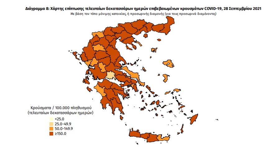 Με βάση τα επιβεβαιωμένα κρούσματα των τελευταίων 7 ημερών, 86 θεωρούνται σχετιζόμενα με ταξίδι από το εξωτερικό και 3.223 είναι σχετιζόμενα με ήδη γνωστό κρούσμα.