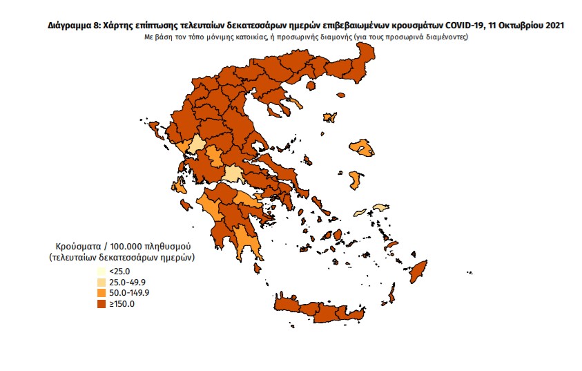 Με βάση τα επιβεβαιωμένα κρούσματα των τελευταίων 7 ημερών, 120 θεωρούνται σχετιζόμενα με ταξίδι από το εξωτερικό και 3.289 είναι σχετιζόμενα με ήδη γνωστό κρούσμα.