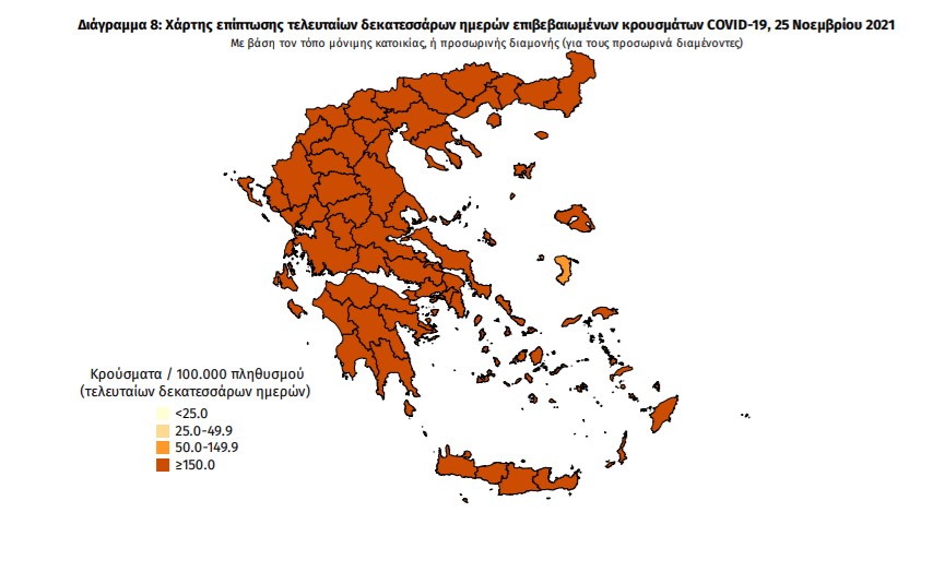 Με βάση τα επιβεβαιωμένα κρούσματα των τελευταίων 7 ημερών, 96 θεωρούνται σχετιζόμενα με ταξίδι από το εξωτερικό και 2.412 είναι σχετιζόμενα με ήδη γνωστό κρούσμα.