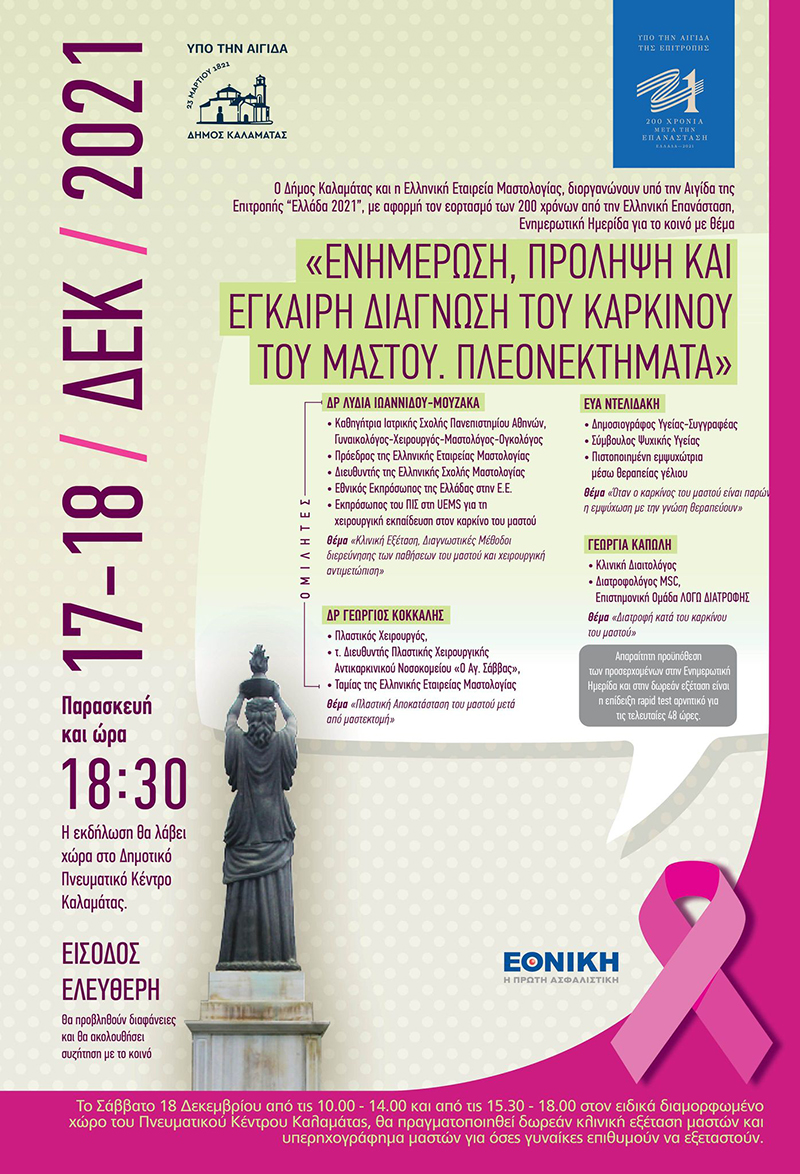 Ειδικότερα, μεθαύριο Παρασκευή στις 6.30 το απόγευμα, θα πραγματοποιηθεί ενημερωτική εκδήλωση με θέμα “Ενημέρωση, πρόληψη και έγκαιρη διάγνωση του καρκίνου του μαστού. Πλεονεκτήματα”. Την εκδήλωση για το κοινό θα συντονίσει η πρόεδρος της Ελληνικής Εταιρείας Μαστολογίας, καθηγήτρια δρ. Λυδία Ιωαννίδου-Μουζάκα.