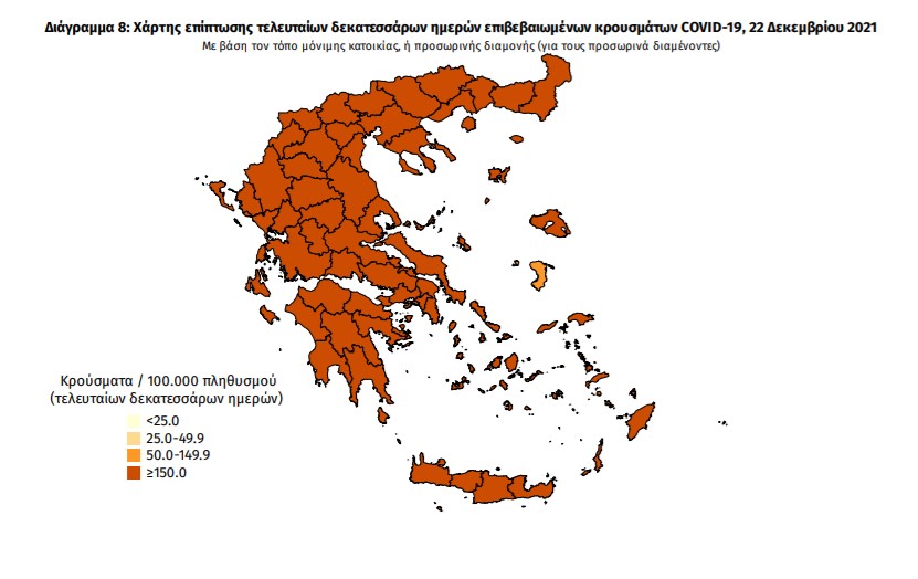 Την εβδομάδα 13 Δεκεμβρίου 2021 - 19 Δεκεμβρίου 2021, το ποσοστό θετικότητας ήταν 1.33% σε σύνολο 2.324.134 εργαστηριακών ελέγχων (RT-PCR/Rapid-Ag) και 0.25% σε σύνολο 3.967.270 αυτοδιαγνωστικών ελέγχων. Στο σύνολο των ελέγχων, το ποσοστό θετικότητας ήταν 0.60%.