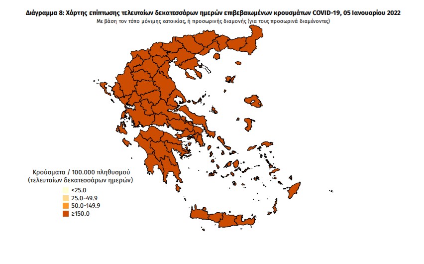 Την εβδομάδα 27 Δεκεμβρίου 2021 - 02 Ιανουαρίου 2022, το ποσοστό θετικότητας ήταν 7.53% σε σύνολο 2.650.521 εργαστηριακών ελέγχων (RT-PCR/Rapid-Ag) και 4.64% σε σύνολο 576.348 αυτοδιαγνωστικών ελέγχων. Στο σύνολο των ελέγχων, το ποσοστό θετικότητας ήταν 5.77%.