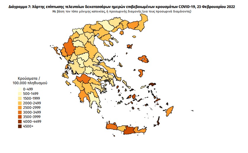 Τα στοιχεία που παρουσιάζονται αφορούν περιστατικά από την επιδημιολογική επιτήρηση της νόσου από το νέο κορoνοϊό (COVID-19), με βάση τα δεδομένα που έχουν δηλωθεί στον ΕΟΔΥ και καταγραφεί μέχρι τις 23 Φεβρουαρίου 2022 (ώρα 15:00).