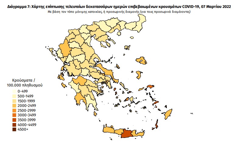Τα στοιχεία που παρουσιάζονται αφορούν περιστατικά από την επιδημιολογική επιτήρηση της νόσου από το νέο κορoνοϊό (COVID- 19), με βάση τα δεδομένα που έχουν δηλωθεί στον ΕΟΔΥ και καταγραφεί μέχρι τις 7 Μαρτίου 2022 (ώρα 15:00).