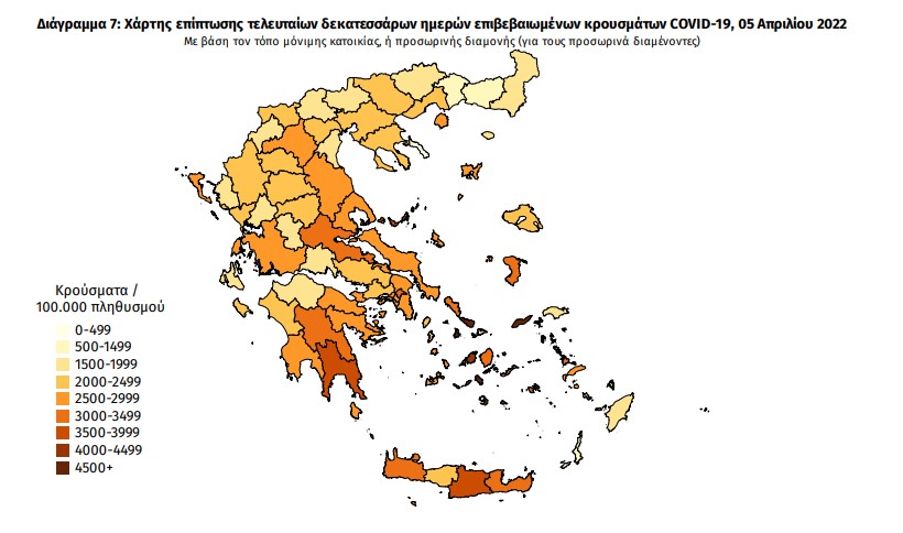Τα στοιχεία που παρουσιάζονται αφορούν περιστατικά από την επιδημιολογική επιτήρηση της νόσου από το νέο κορονοϊό (COVID19), με βάση τα δεδομένα που έχουν δηλωθεί στον ΕΟΔΥ και καταγραφεί μέχρι τις 05 Απριλίου 2022 (ώρα 15:00).