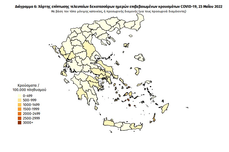 Τα νέα εργαστηριακά επιβεβαιωμένα κρούσματα της νόσου(άτομα) που καταγράφηκαν τις τελευταίες 24 ώρες ήταν 2.235. Ο συνολικός αριθμός των ατόμων που νόσησαν ανέρχεται σε 3.422.233 (ημερήσια μεταβολή +0.1%), εκ των οποίων 48.8% άνδρες.
