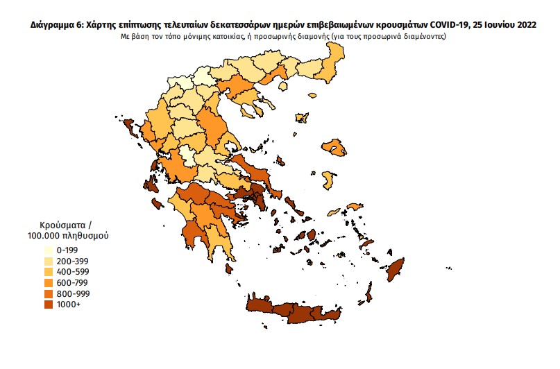 Τα στοιχεία που παρουσιάζονται αφορούν περιστατικά από την επιδημιολογική επιτήρηση της νόσου από το νέο κορωνοϊό (COVID-19), με βάση τα δεδομένα που έχουν δηλωθεί στον ΕΟΔΥ και καταγραφεί μέχρι τις 25 Ιουνίου 2022