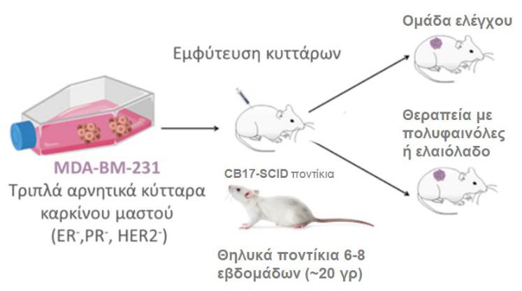 Τα αποτελέσματα αυτά ώθησαν τους ερευνητές να ελέγξουν σε ποντίκια με καρκίνο του μαστού την αντικαρκινική δράση μίγματος όλων των φαινολών (Ολικό Φαινολικό Εκχύλισμα Ελαιολάδου). Τα πειραματόζωα αυτά, δεν παράγουν Β και Τ λεμφοκύτταρα του ανοσοποιητικού συστήματος και επιτρέπουν έτσι την ανάπτυξη όγκων μετά από εμφύτευση ανθρώπινων καρκινικών κυττάρων (ξενογραφήματα) (Εικόνα 2). Οι καρκινικοί όγκοι δημιουργήθηκαν με εμφύτευση κάτω από το δέρμα, καρκινικών κυττάρων μαστού από άνθρωπο, ανθεκτικών σε χημειοθεραπεία (κύτταρα MDA-MB231) (Εικόνα 2).