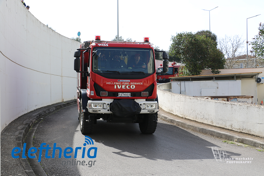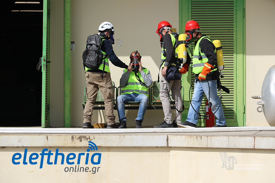 Το σενάριο της άσκησης περιελάμβανε και πρόκληση πυρκαγιάς και απεγκλωβισμό ατόμων από γερανοφόρο όχημα της Πυροσβεστικής Υπηρεσίας.