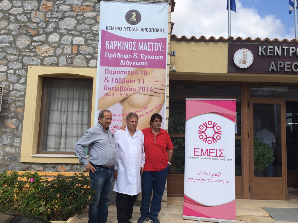 Το διήμερο, όπως σημειώνεται στη σχετική ανακοίνωση του Κ.Υ. Αρεόπολης, έγινε σε συνεργασία με την Επιστημονική Μαστολογική Εταιρεία - Ιαση - Στήριξη «ΕΜΕΙΣ», τελούσε δε υπό την αιγίδα του Δήμου Ανατολικής Μάνης. Οπως σημειώνεται επίσης, κατά την ενημερωτική εκδήλωση που πραγματοποιήθηκε στη διάρκεια του διημέρου, τόσο ο διευθυντής του Κέντρου Υγείας Αρεόπολης Ανάργυρος Μαριόλης όσο και ο πρόεδρος της «ΕΜΕΙΣ» Γρηγόρης Ξεπαπαδάκης, επεσήμαναν στις ομιλίες τους τις αλλαγές στις συμπεριφορές υγείας που επέφερε η οικονομική κρίση και την ολοένα αυξανόμενη επίπτωση του καρκίνου του μαστού. Παράλληλα ανέφεραν ότι «ο καρκίνος του μαστού αποτελεί την πιο συχνή νεοπλασία των γυναικών και την πρώτη αιτία θανάτου αυτών στις ηλικίες 45 - 60 ετών. Οι κακοήθειες του γυναικείου φύλου και δη του μαστού, συχνά διαλάθουν της προσοχής και υποεκτιμώνται από τις παθούσες, περιορίζοντας έτσι τις δυνατότητες της θεραπευτικής παρέμβασης. Είναι χαρακτηριστικό ότι στην Ελλάδα, η διάγνωση του καρκίνου του μαστού σε πρώιμο στάδιο, είναι υποπολλαπλάσια σε σύγκριση με την υπόλοιπη Ευρώπη».