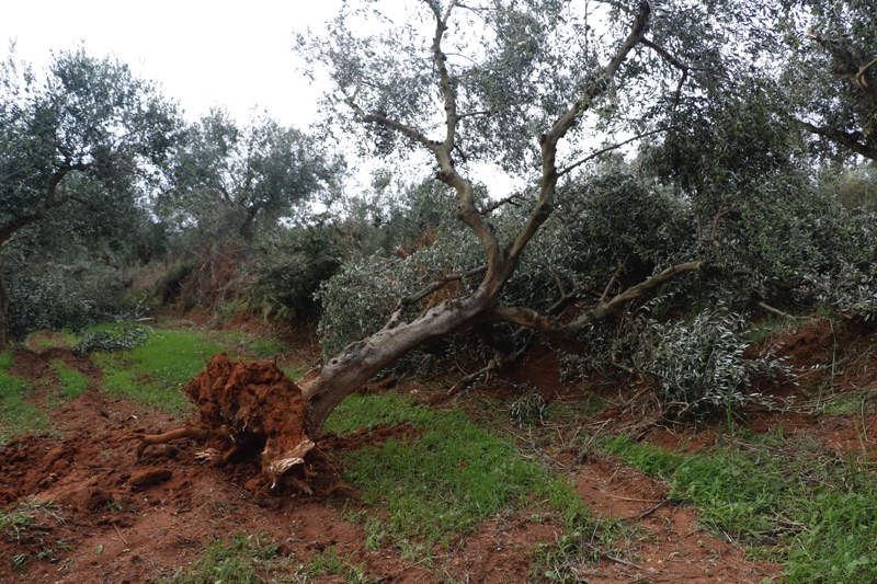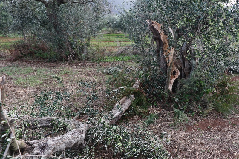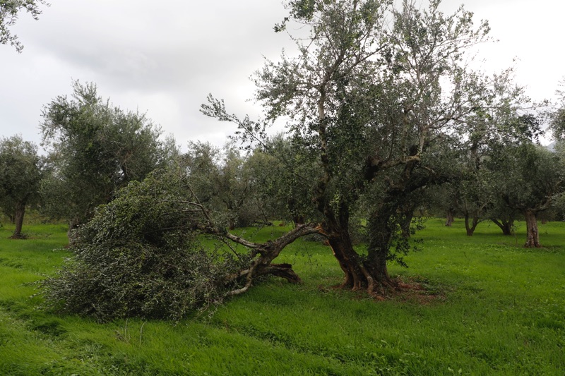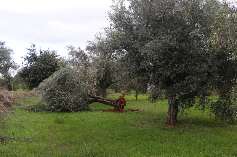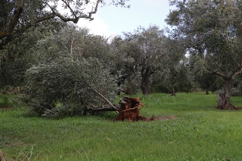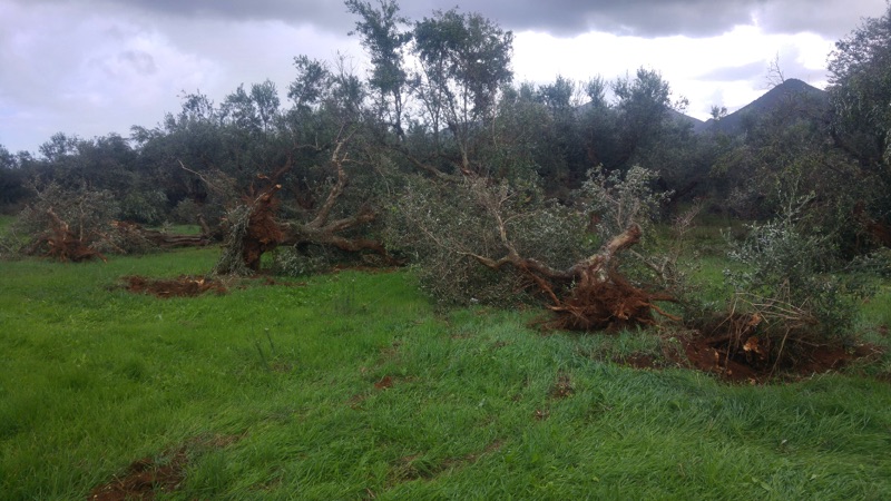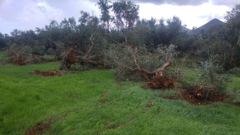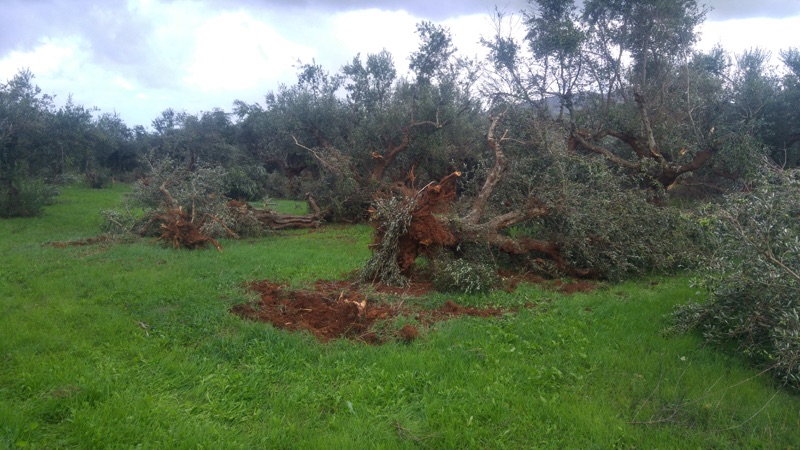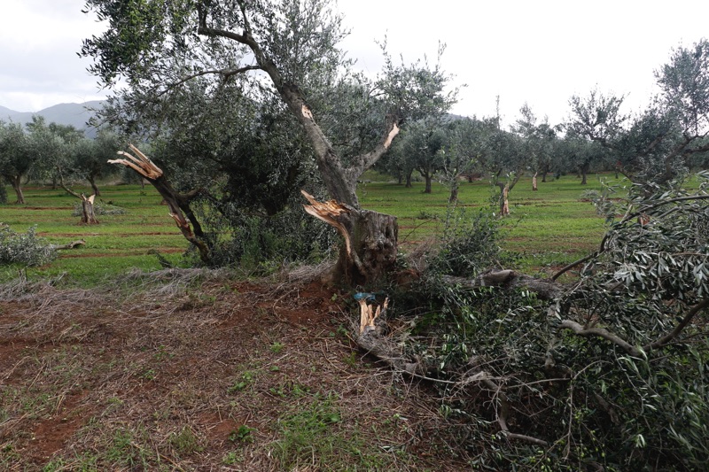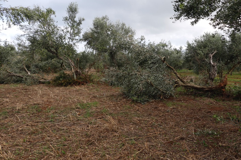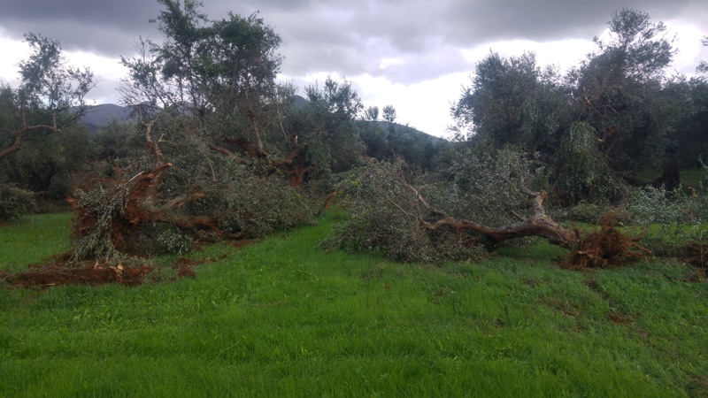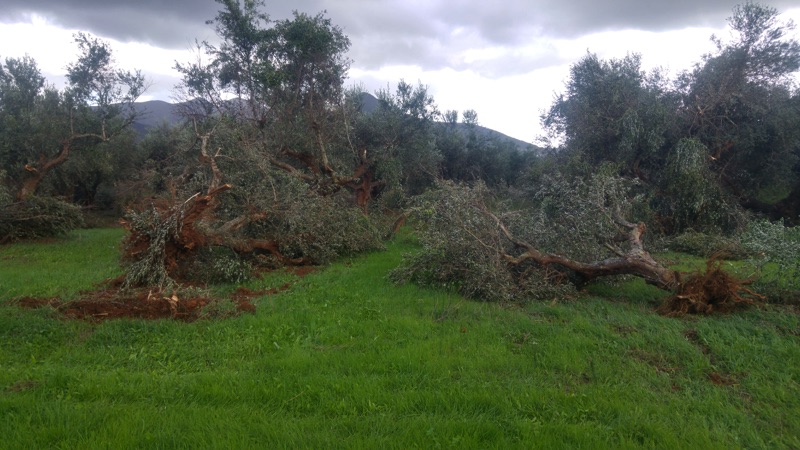 Στην περιοχή Χανδρινού - Κρεμμυδίων ο ανεμοστρόβιλος ξερίζωσε κι έσπασε, εξαφάνισε κυριολεκτικά ελαιόδεντρα μεγάλα και πολλών χρόνων. Δέντρα παρασύρθηκαν σε άλλα κτήματα, λες και ήταν κάποιο ελαφρύ αντικείμενο, ενώ συναντήσαμε εικόνα με δύο ξεριζωμένες ελιές να έχουν... σκαρφαλώσει πάνω σε μια άλλη που άντεξε.