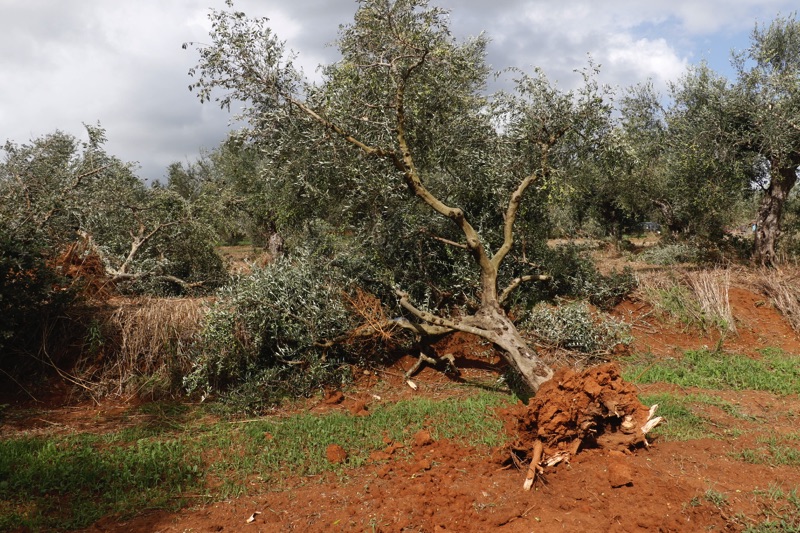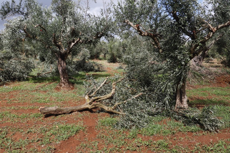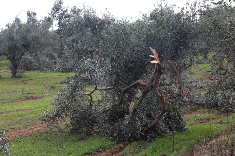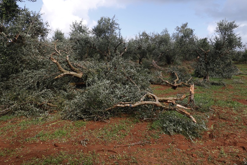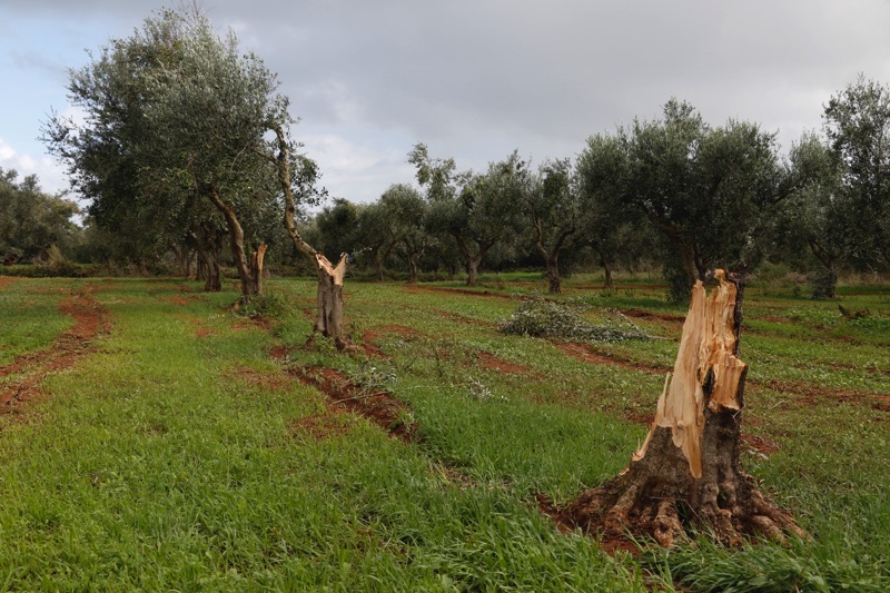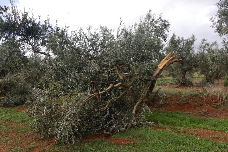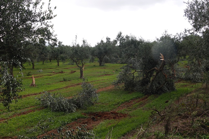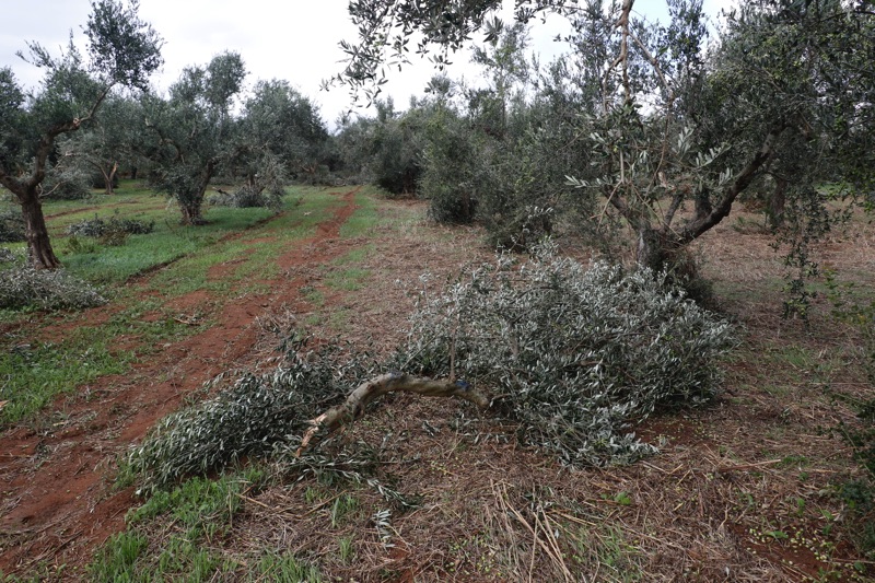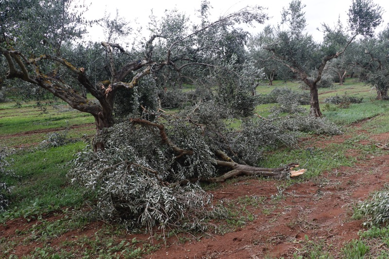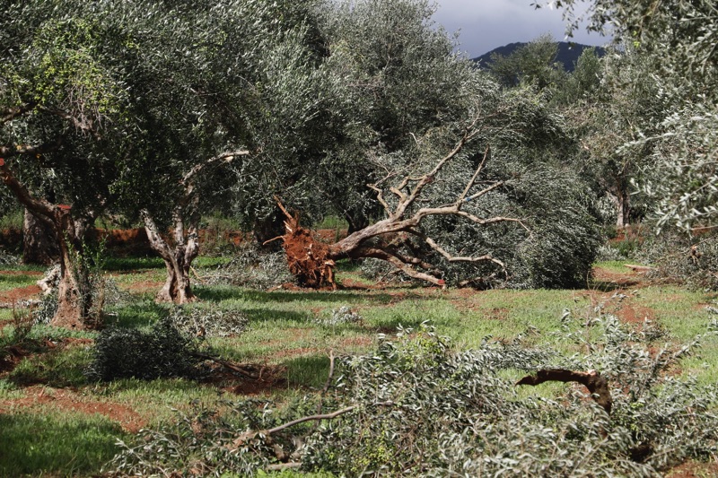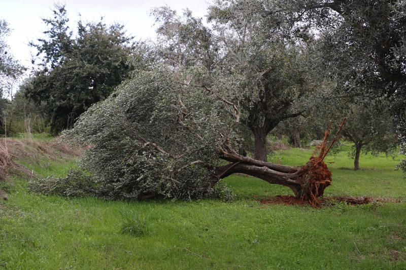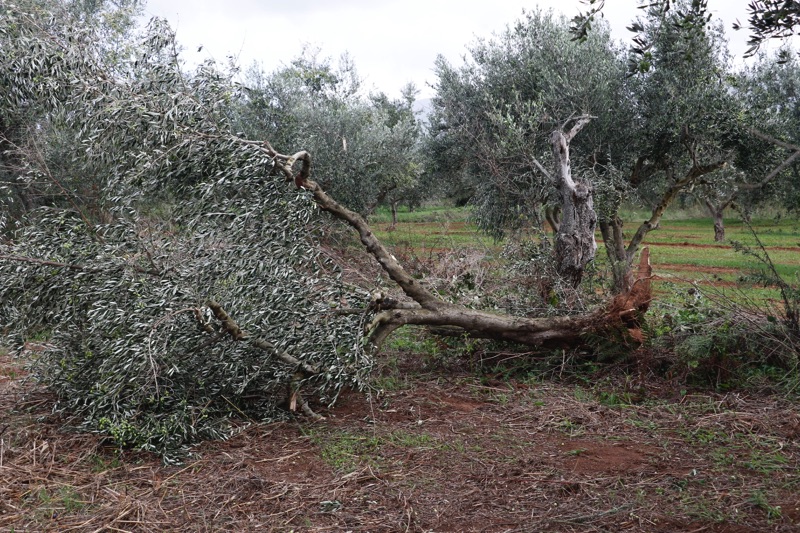 Στην περιοχή Χανδρινού - Κρεμμυδίων ο ανεμοστρόβιλος ξερίζωσε κι έσπασε, εξαφάνισε κυριολεκτικά ελαιόδεντρα μεγάλα και πολλών χρόνων. Δέντρα παρασύρθηκαν σε άλλα κτήματα, λες και ήταν κάποιο ελαφρύ αντικείμενο, ενώ συναντήσαμε εικόνα με δύο ξεριζωμένες ελιές να έχουν... σκαρφαλώσει πάνω σε μια άλλη που άντεξε.