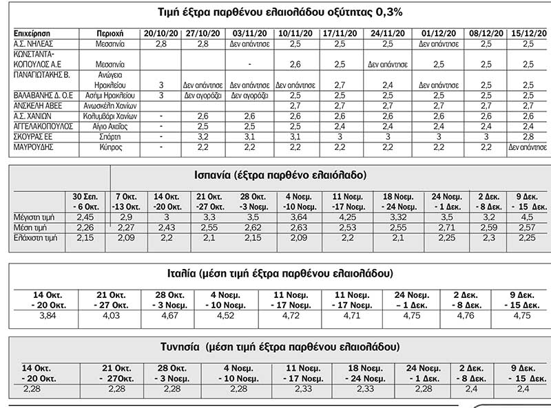 Ο παραπάνω "χάρτης" των τιμών του έξτρα παρθένου ελαιολάδου διαμορφώνεται βάσει του παρατηρητηρίου του Συνδέσμου Ελαιοκομικών Δήμων Κρήτης (ΣΕΔΗΚ) και της εβδομαδιαίας έρευνας του ιταλικού Ινστιτούτου Υπηρεσιών Γεωργίας και Αγοράς Τροφίμων (ISMEA). Αναλυτικά οι τιμές ανά χώρα παρουσιάζονται στους πίνακες.