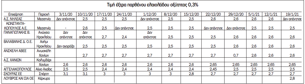 Στη συμβατική αγορά οι έμποροι εξακολουθούν να αγοράζουν το ελαιόλαδο από 2,50 ευρώ το κιλό στη Μεσσηνία έως 2,80 ευρώ το κιλό στην Κέρκυρα. Στη διεθνή αγορά το επταήμερο 13 -19 Ιανουαρίου η μέση τιμή στην Τυνησία διαμορφώθηκε στα 2,48 ευρώ το κιλό, στην Ισπανία στα 2,5 ευρώ και στην Ιταλία στα 4,75 ευρώ το κιλό.