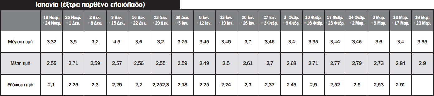 Στην Ισπανία η μέση τιμή αυξήθηκε από 2,84 σε 2,9 ευρώ το κιλό, στην Τυνησία η μέση τιμή επίσης παραμένει σταθερή στα 2,85 ευρώ το κιλό, ενώ στην Ιταλία η μέση τιμή μειώθηκε οριακά από 4,69 σε 4,68 ευρώ το κιλό.