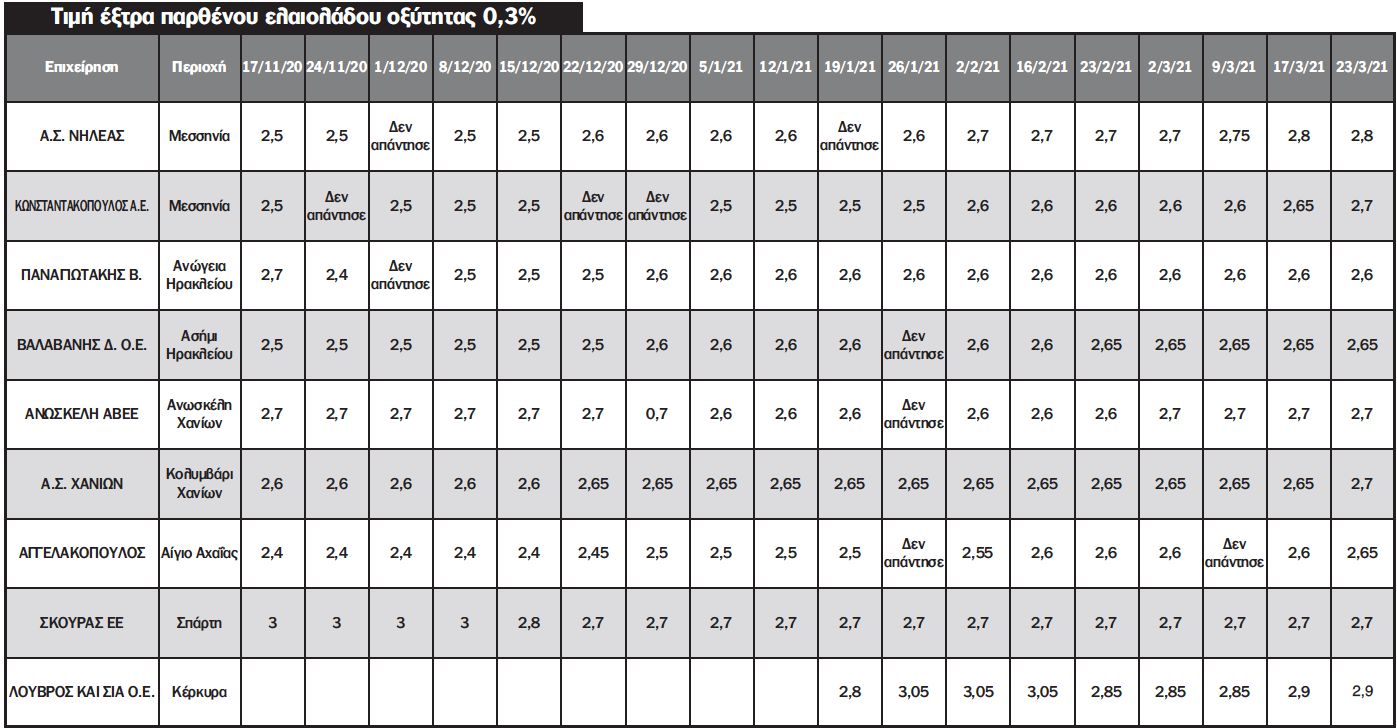 Τιμή έξτρα παρθένου ελαιολάδου οξύτητας 0,3%