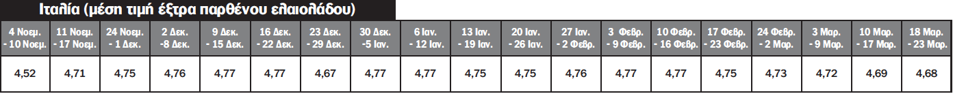 Ιταλία (μέση τιμή έξτρα παρθένου ελαιολάδου)