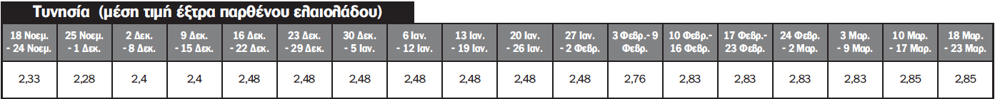 Τυνησία (μέση τιμή έξτρα παρθένου ελαιολάδου)