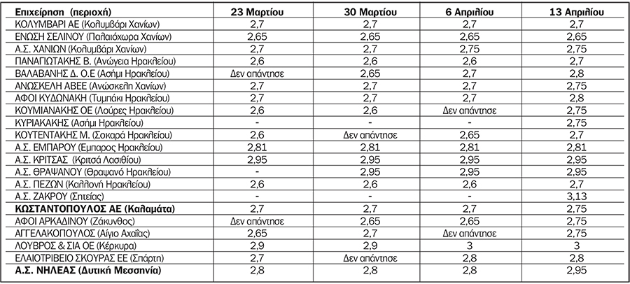 Αναλυτικά στον πίνακα οι τιμές στην Ελλάδα, σύμφωνα με το παρατηρητήριο τιμών του Συνδέσμου Ελαιοκομικών Δήμων Κρήτης (ΣΕΔΗΚ).